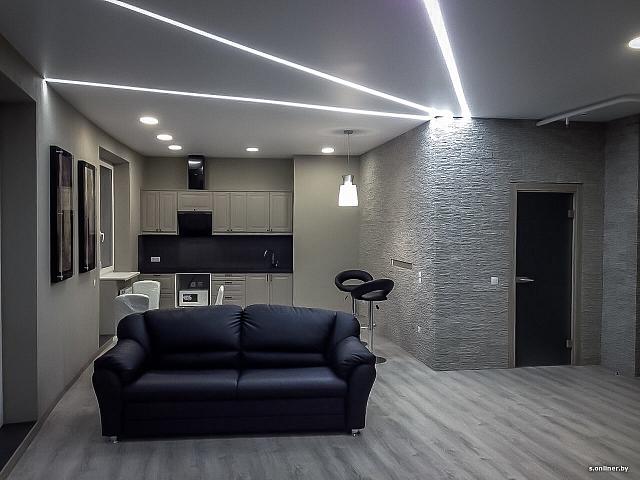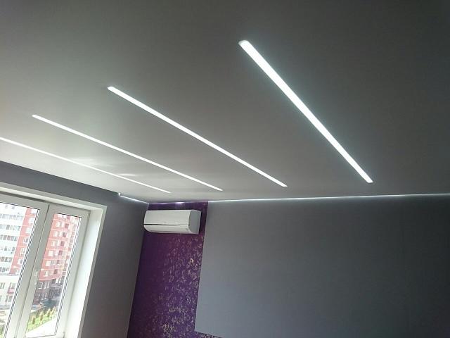 С помощью светящихся полос на потолке можно подчеркнуть основные элементы интерьера и разделить пространство на функциональные зоны. Для этого используются специальные профили со светопропускающей крышкой или без неё. Внутри профиля размещается светодиодная лента, а сам профиль устанавливается вровень с натяжным потолком.