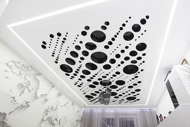 Такие полосы выглядят оригинально и гармонично на поверхности потолка. Они могут иметь различные формы и располагаться в любом месте, а их длина может быть разной. Вариантов оформления здесь множество, и всё зависит от вашей фантазии и фантазии дизайнера.