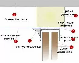 Существует два варианта установки шкафа-купе с натяжным потолком. В первом случае потолок устанавливается по всей площади помещения, на месте, где будут крепиться направляющие от шкафа устанавливают закладную конструкцию. В таком случае потолок будет и в самом шкафу. В другом случае, крепления для потолка устанавливают на закладной для шкафа, где в последствии будут крепиться направляющие. В этом случае потолок будет установлен до шкафа-купе.
