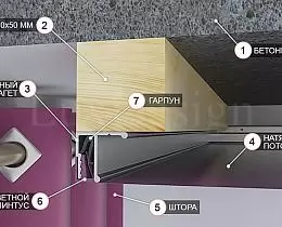 Существует два варианта крепления потолочного карниза. Это потолочный карниз или ниша под карниз. Потолочный карниз крепиться к установленной закладной под натяжным потолком. В случае ниши под карниз, потолок не доходит до окна, оставляется пространство и в это пространство крепится карниз. Выглядит это так, как будто шторы спускаются из-под потолка.